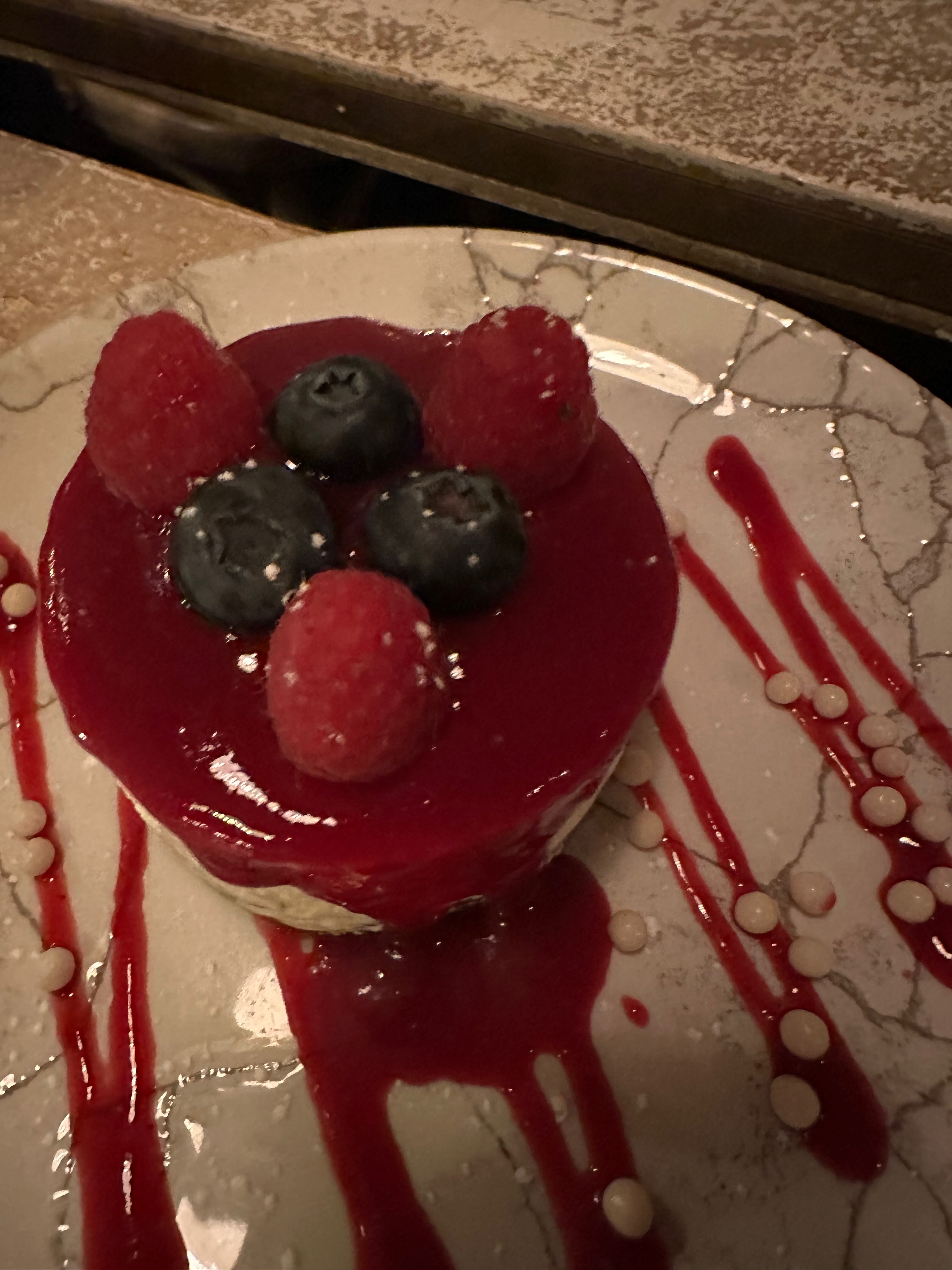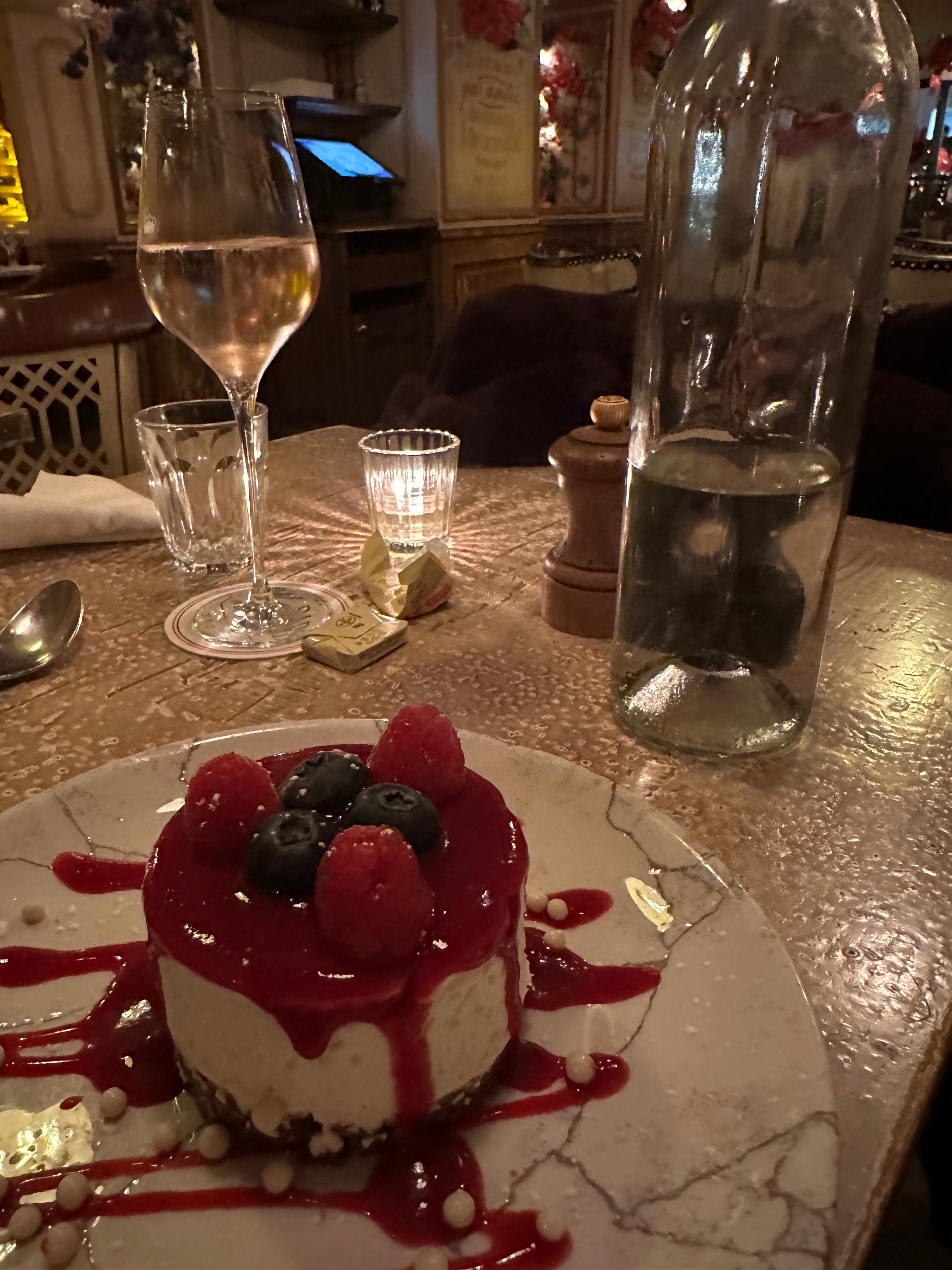 Cheesecake aux Fruits RougesRed fruit coulis with fresh raspberries and blueberriesThe best cheesecake, paired with house champagne