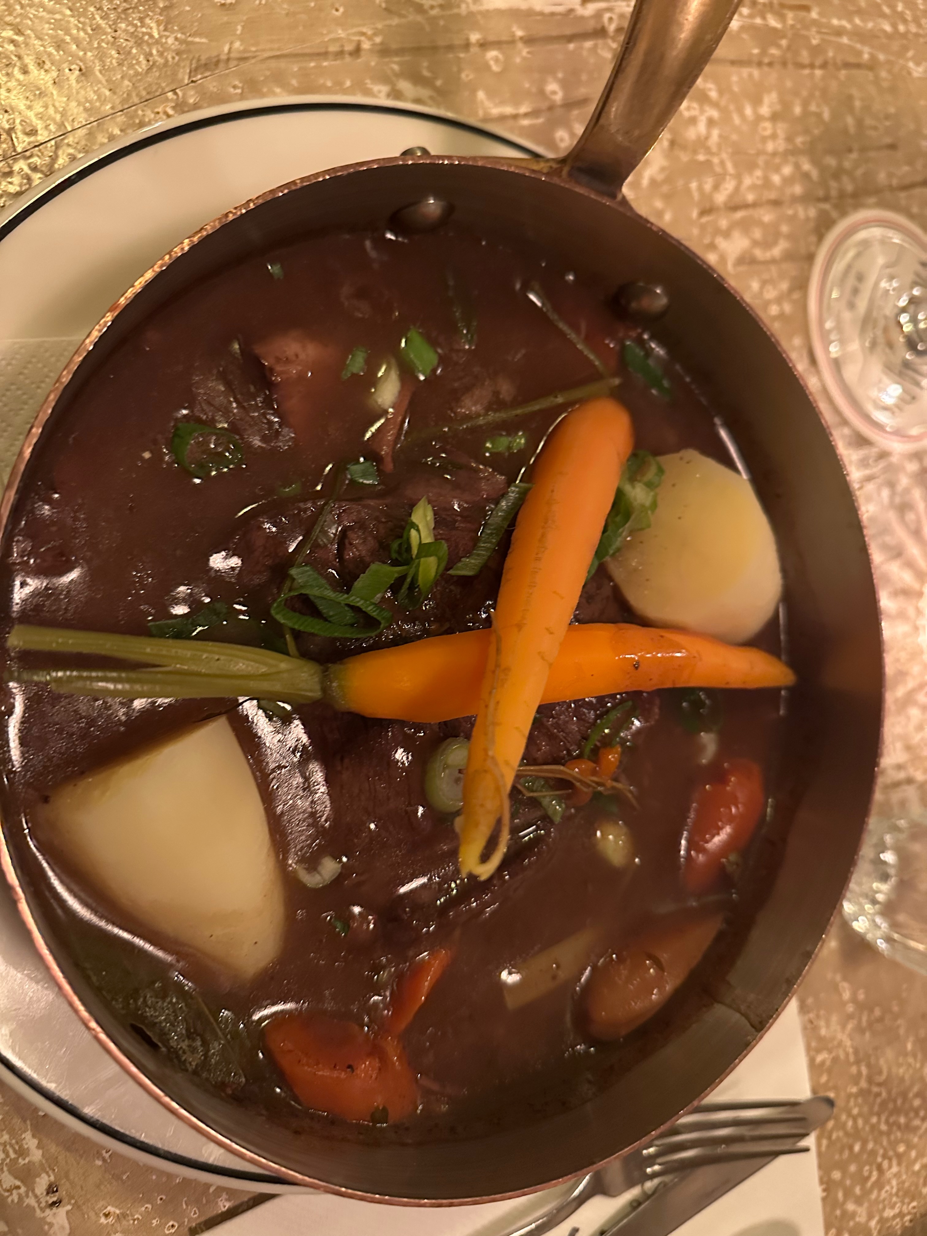 The stew — generous, rich, and served in copperSlow-braised beef with carrots, potatoes, and fresh herbs