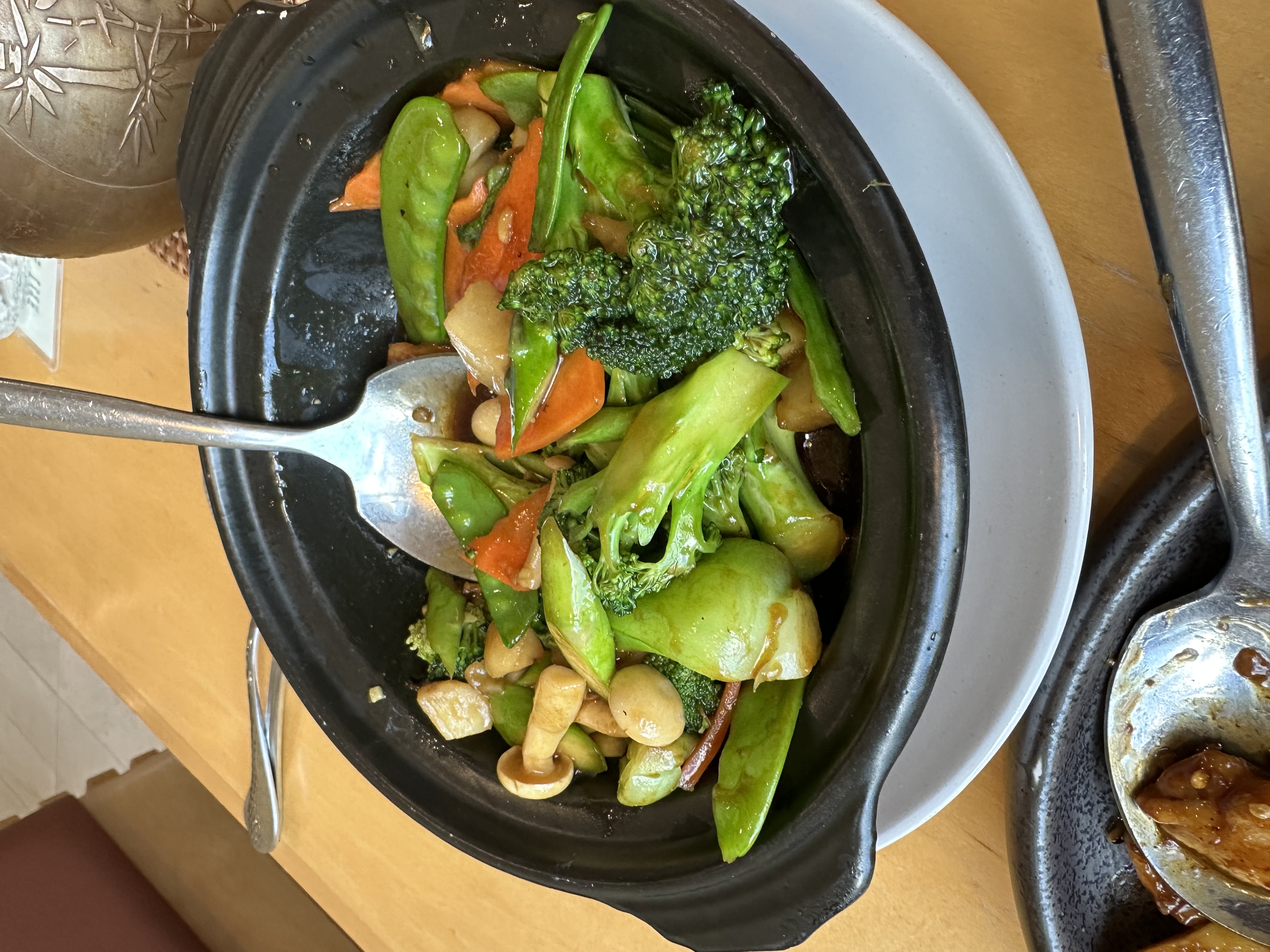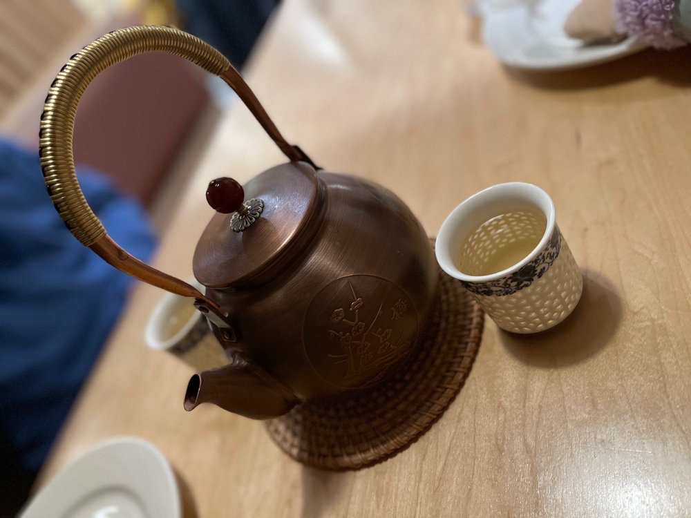 But what is a meal without the ceremony of tea? The oolong tea, served in a pot that seemed to cradle the essence of ancient traditions, was a delicate performance in itself. The teapot itself was a work of art — a handsome copper vessel with an elegantly wrapped brass handle, adorned with a polished carnelian bead on the lid and Chinese characters etched into its side. It sat upon a woven rattan coaster as though it had been placed there by centuries of ritual.
