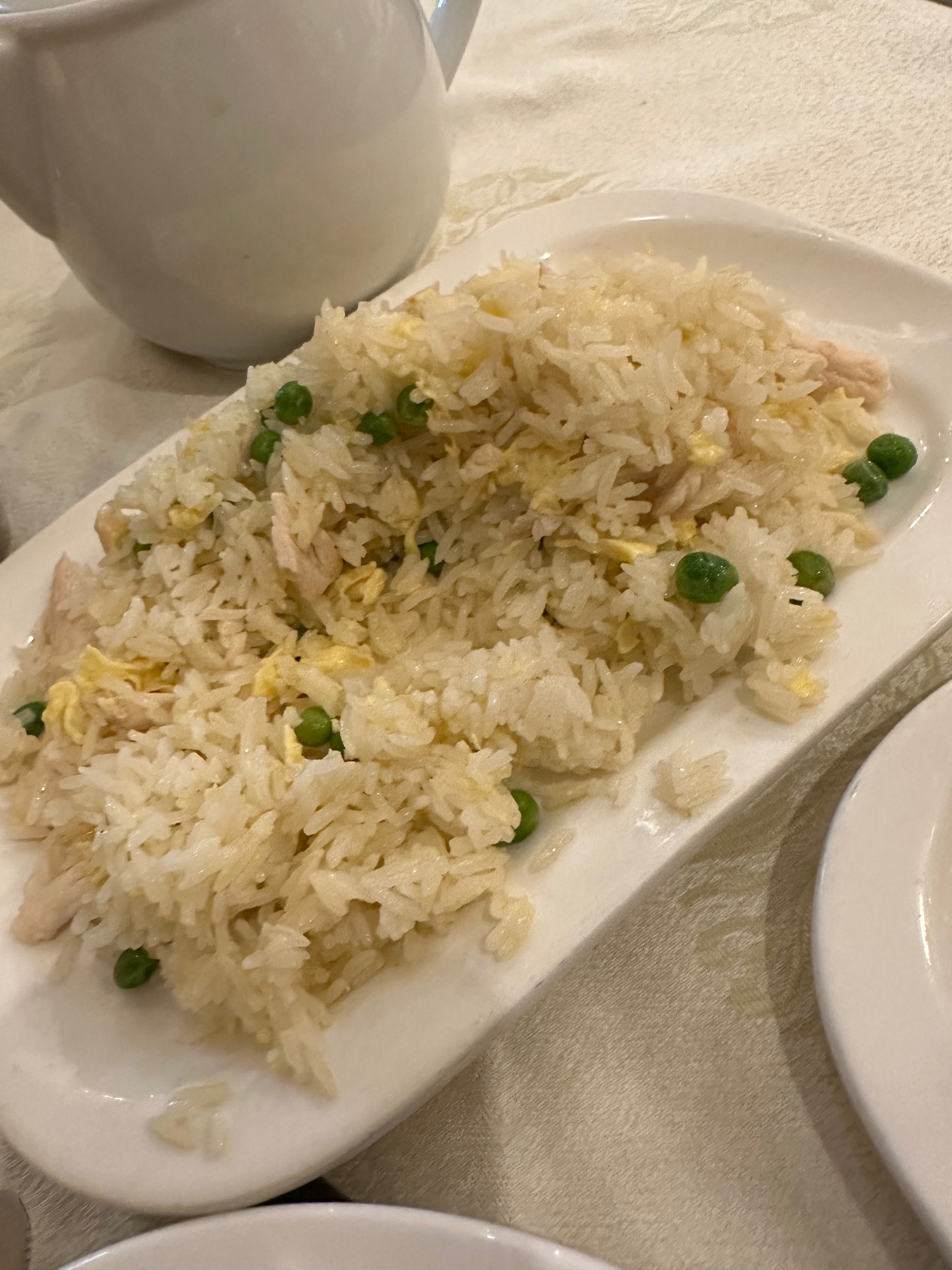 The fried rice was notably different from what you find at American Chinese restaurants. It was not colored with soy sauce and not oily—light, clean, with egg and green peas scattered throughout. This is a good example of the differences between French Chinese and American Chinese cooking. The approach here is more restrained, letting the rice speak for itself.