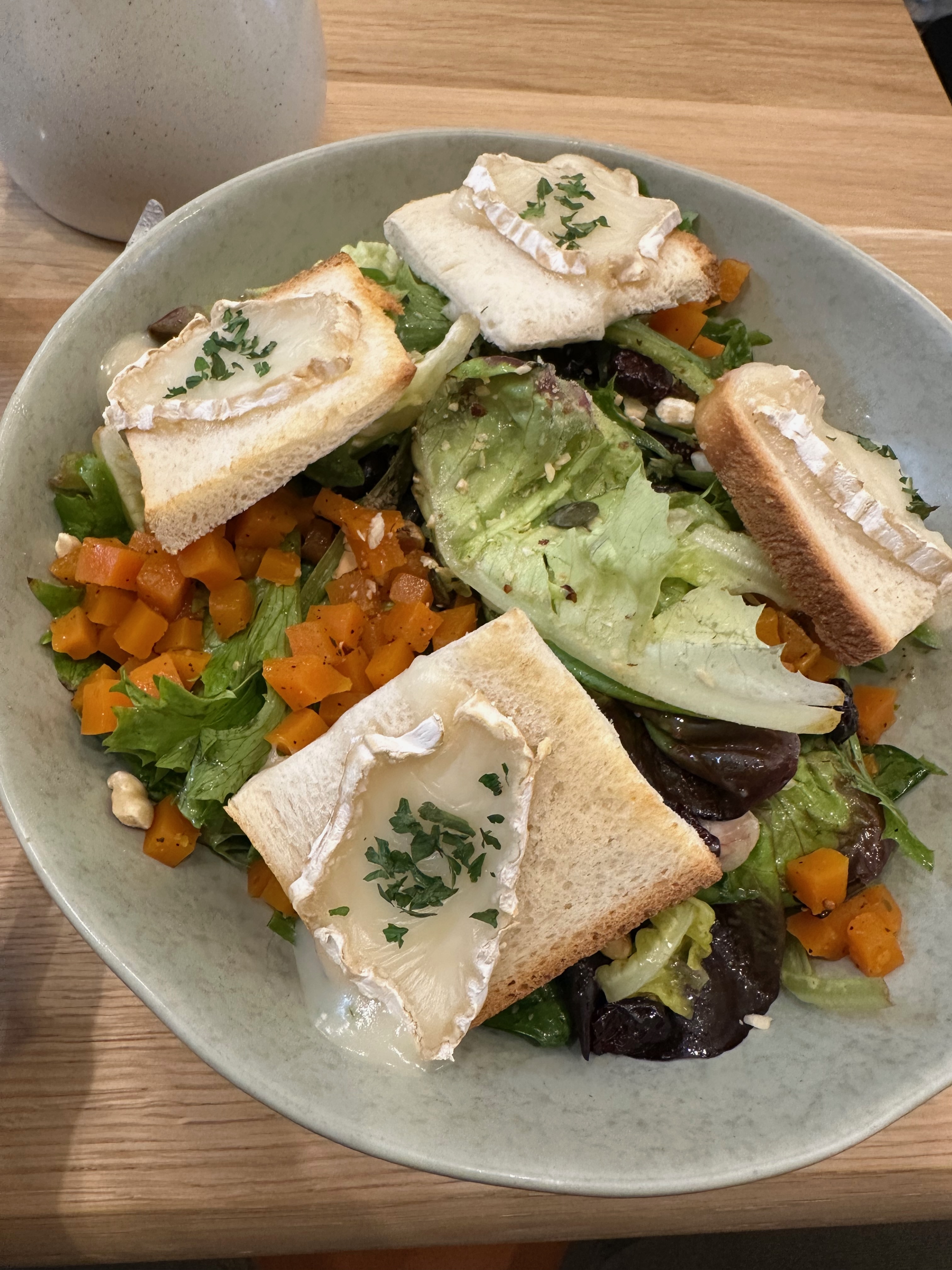 The Salade Chèvre Chaud arrives generous and composed. A bed of mixed greens is layered with honey-roasted courges (squash), toasted hazelnuts, pumpkin seeds, cranberries, and topped with warm goat cheese toasts — the chèvre melted just enough to soften and spread, with its edges golden from the heat. A mustard vinaigrette ties everything together with a gentle sharpness that lifts the sweetness of the roasted squash.